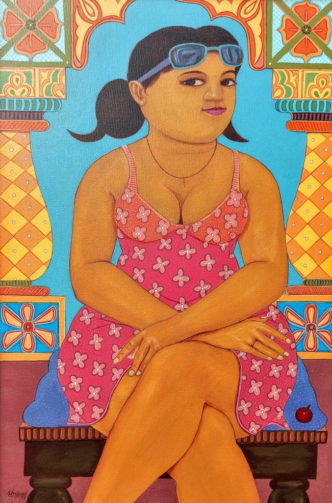 Life by the sea is omnipresent. Materials like shells or oysters are chosen as artistic means, scenes from current Goa life are selected – as if to once more reinforce the artists local origins. As scenes of chatting fisherwomen evolve into girls with fancy swimsuits and diving goggles – traditional styles of naïve painting with their bright and colorful tableaus are pursued further and continue to influence the Goa art scene.