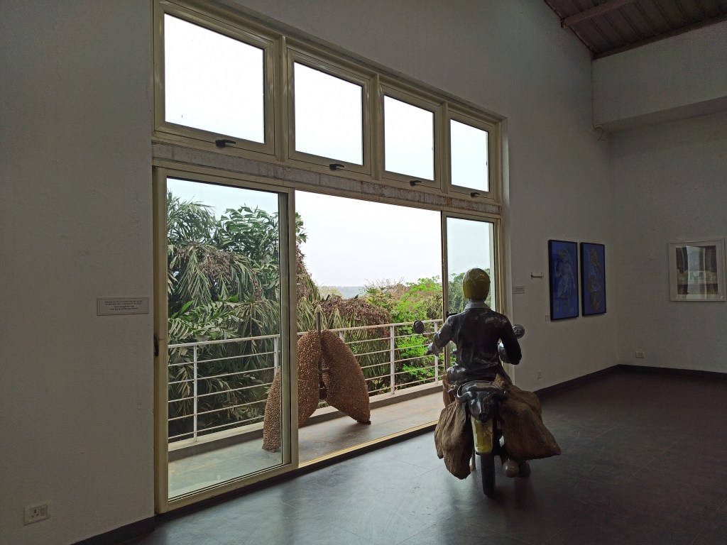About half of the art works on display are by the founder – beside pieces by Viraj Naik, Bharat Dodiya, Akshay Chari, Santosh Morajkar and others – the variety of forms and art techniques is impressive: video-installations, sculptures, ready-mades, photographies and paintings are exhibited on three floors. A sculpture garden opens up on the backside of the museum, from where the view engulfs into the greenery of a Goa tropical forest.
