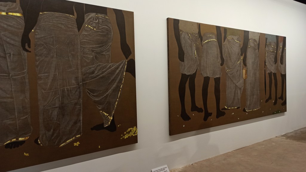 The Kochi-Muzirirs Biennale features many local artists from Kerala. One of my favourite works from the main exhibition halls are these two large paintings by Devi Seetharam. A scene from South India, men in conversation in a public space, we only see the lower half of their bodies. Reading the objects in their hands like a tiffin box or an umbrella and the way they wear their white dhoti, we can try to identify their social status and where they are actually standing, in front of a temple or being part of a political rally. Public spaces in India can at specific times of the day occupied by almost all male crowds. Women tied to their duties in the domestic zones, are much less visible in public. Devi Seetharam watches the men, though she deprives them of their full expressions by cutting their upper bodies short. Interesting how the focus of our attention shifts towards a foot held up, or a fold in the tissue from ironing and storing the dhotis. The flower petals on the ground hint to the performance of a Puja – a ritual in Hinduism – nearby.